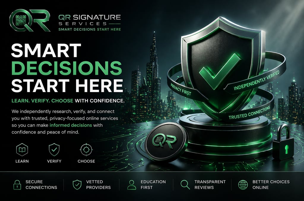 Disclaimer: QR Signature Services is an independent, education-first platform designed to help users make smarter, more secure decisions online. We do not provide legal, financial, or professional advice, and no content on this site or any associated sites should be relied upon as such advice. We evaluate and reference third-party providers using our own verification standards, and we may receive compensation through affiliate relationships. That said, our core model is built on independence, privacy, and informed decision-making—not paid placement or influence. If a service does not meet our standards for security, transparency, and reliability, it is not recommended. Every listing exists to reduce risk, increase clarity, and give you a better starting point than the open Internet.
